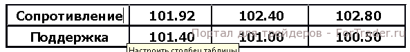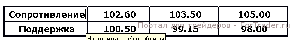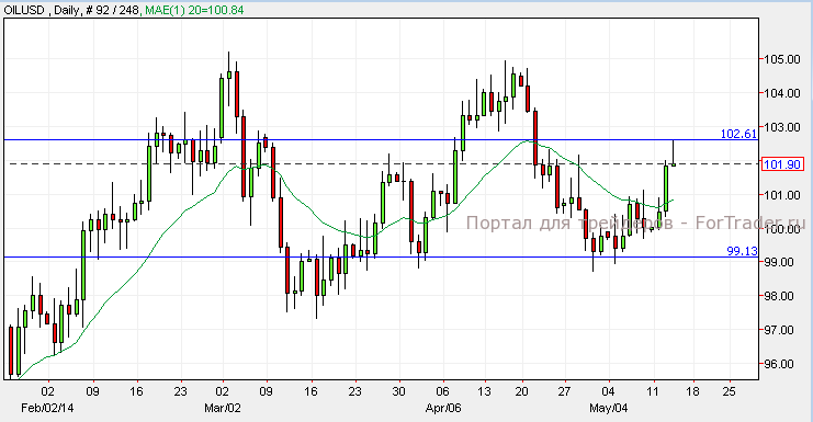 Цена нефти закрылась с небольшим повышением и коснулась уровня сопротивления 102.60. Запас сырой нефти оказался выше прогнозов и вызвал падение котировок в течении торгового дня. 20-дневная скользящая средняя поддерживает восходящий тренд, но если черное золото не удержит уровень сопротивления 102.60, цена упадет к отметке 99.15.