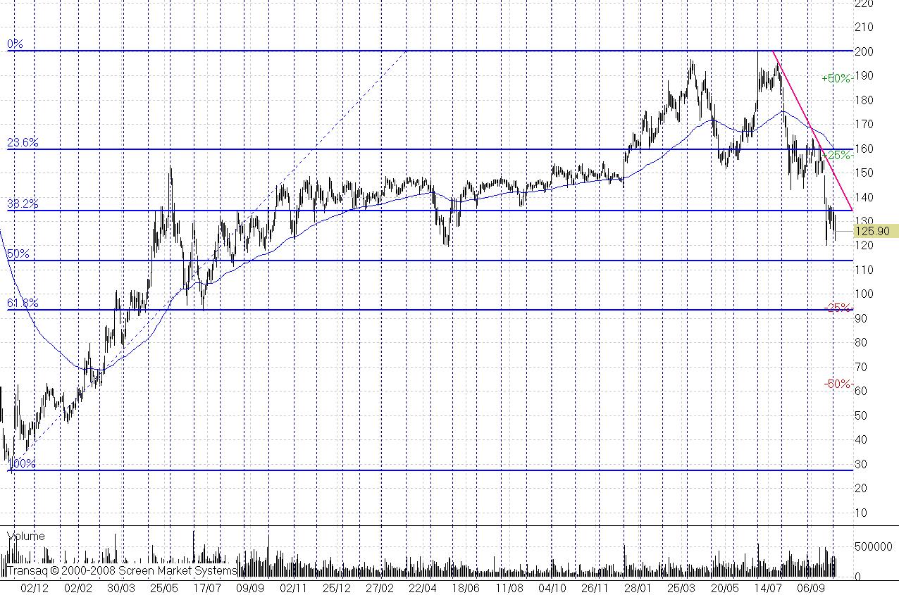 Что бросается в глаза – на графике «Татнефти» всего один июльский нисходящий тренд, на многих «голубых фишках» и бумагах «второго эшелона» мы видим по три-четыре витка январских или апрельских нисходящих движений. Значит, в случае прихода на рынок «быков», после того, как акции покорят отметку 140 рублей, их особо ничего сдерживать не будет. Пока этот тренд жив, я считаю равновероятным поход к уровню 115 и 95 рублей (линии коррекции по Фибоначчи к посткризисному росту 2009-2011 года).