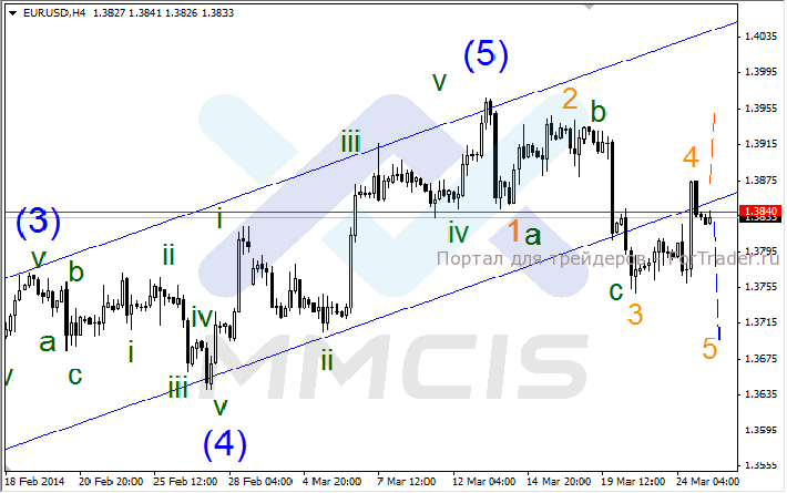 В качестве основного сценария рассматривается снижение котировки в волне «5» к отметке 1.3700. В качестве альтернативного сценария рассматривается пробой уровня сопротивления 1.3840, что может привести к росту единой валюты в район отметки 1.3940.