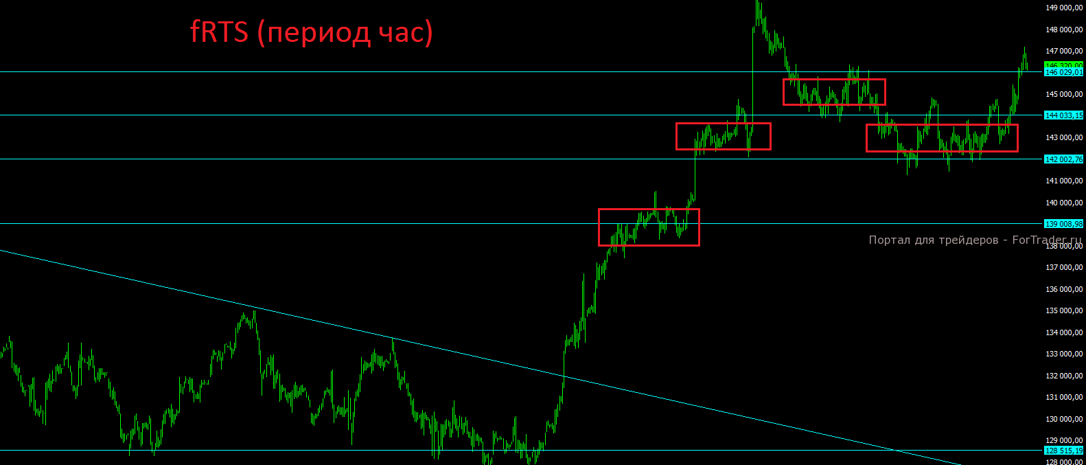 Фьючерс на индекс РТС после закрытия накануне дня выше отметки 144000, довольно технично дошёл до верхней границы другого диапазона на отметке 146000 и пока остаются все шансы на финальный выход с обновлением предыдущего максимума и с пробоем отметки 150000. В случае пробоя уровня 144000 вниз и закрытия дня под ним, стоит присматриваться к открытию коротких позиций.