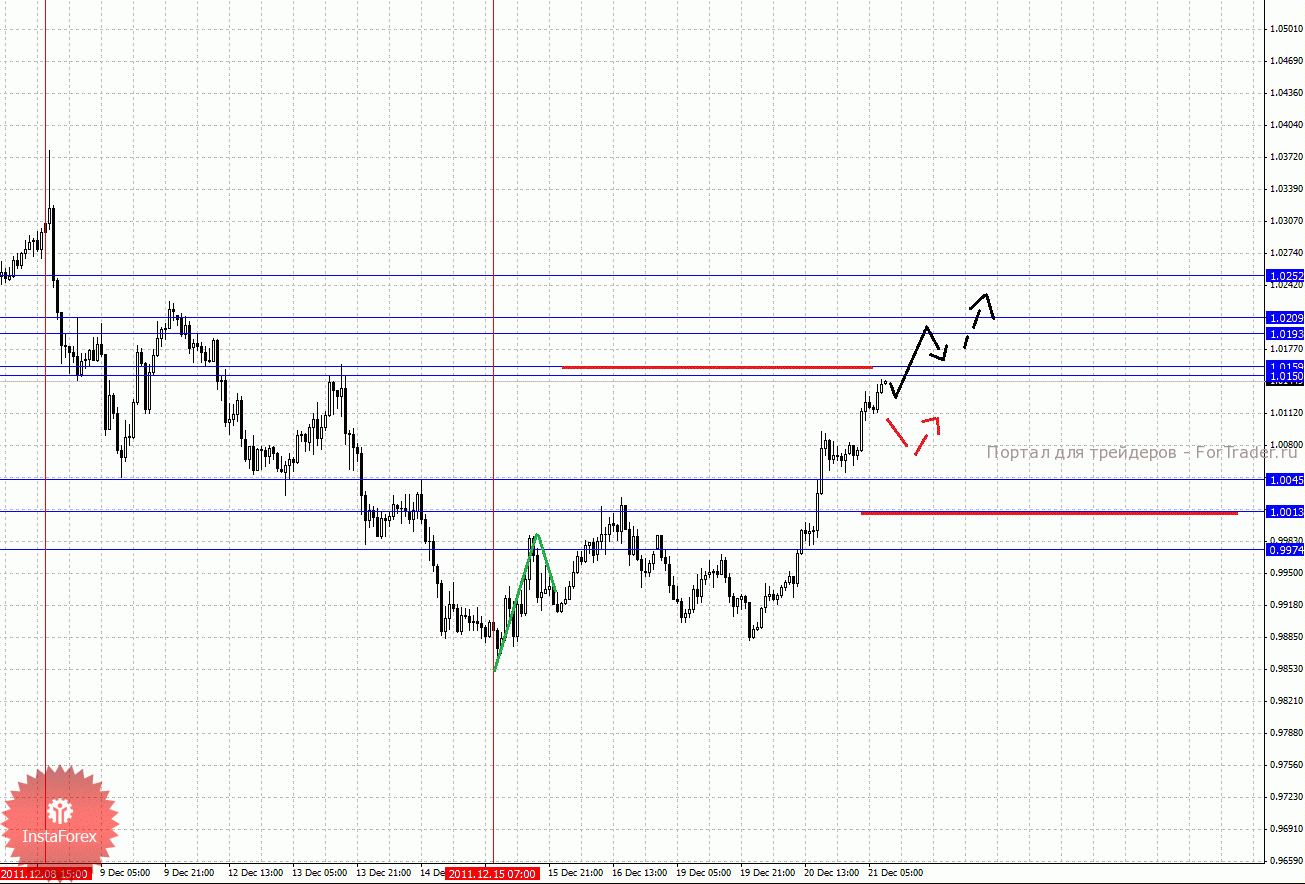 По паре Австралийский доллар/Доллар ключевыми уровнями являются: 1.0252, 1.0209, 1.0193, 1.0159, 1.0150, 1.0045, 1.0013 и 0.9974. Здесь мы следим за восходящим циклом от 15 декабря. Продолжения движения кверху ожидаем после прохода ценой шумового диапазона 1.0150 – 1.0159, в данном случае цель 1.0193, в коридоре 1.0193 – 1.0209 консолидация цены. Потенциальным значением для верха считаем уровень 1.0252, по достижении которого ожидаем консолидацию. Корректировочное нисходящее движение возможно в диапазоне 1.0045 – 1.0013, пробой последнего значения окажет негативное влияние на развитие восходящей структуры от 15 декабря, в данном случае потенциальная цель 0.9974. До уровня 0.9974 уже должны будут оформиться начальные условия для последующего развития нисходящей тенденции.