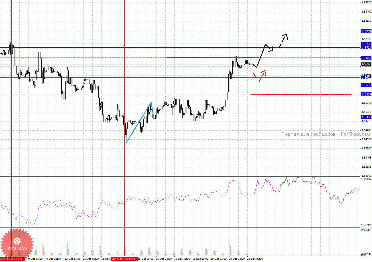 По паре Фунт/Доллар ключевыми уровнями являются: 1.5779, 1.5736, 1.5724, 1.5689, 1.5621, 1.5596, 1.5564 и 1.5486. Здесь мы следим за восходящим циклом от 14 декабря. Продолжения движения кверху ожидаем после пробоя 1.5689, в данном случае цель 1.5724, возле этого уровня консолидация цены. Проход ценой шумового диапазона 1.5724 – 1.5736 позволит рассчитывать на движение к потенциальной цели – 1.5779. Корректировочное нисходящее движение ожидаем в коридоре 1.5621 – 1.5596, пробой последнего значения приведет к углубленной коррекции, здесь цель 1.5564, от этого уровня есть вероятность разворота кверху, его пробой окажет негативное влияние на развитие восходящей тенденции в масштабе Н1. Уровень 1.5486 является ключевым сопротивлением для низа и пока интересен с точки зрения среднесрочной перспективы.