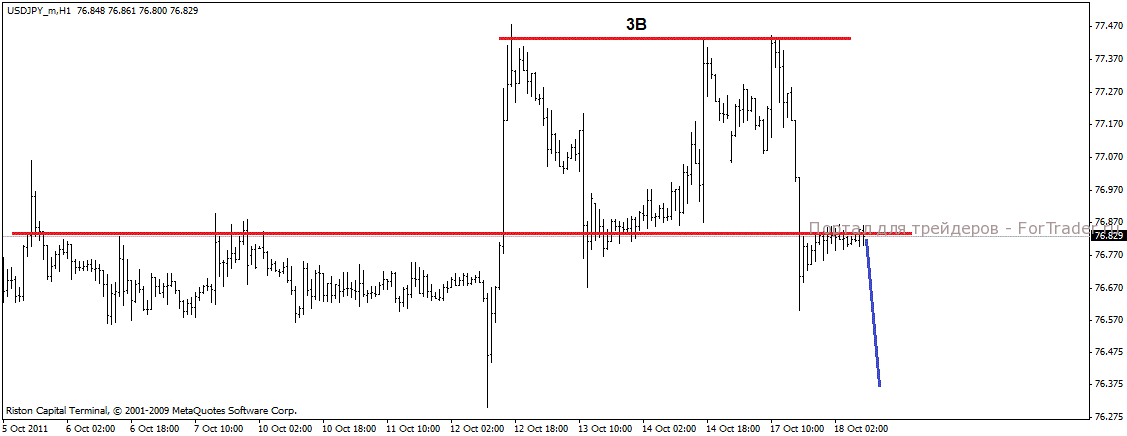 По USD/JPY образовалась тройная вершина, куда более мощный паттерн, цена стремительно полетела вниз, прошив уровень поддержки, однако вернулась к этому уровню с другой стороны, очевино для ретеста. В дальнейшем очевидно нас ожидает продолжение укрепления японской валюты цель на сегодняшний день 76.40