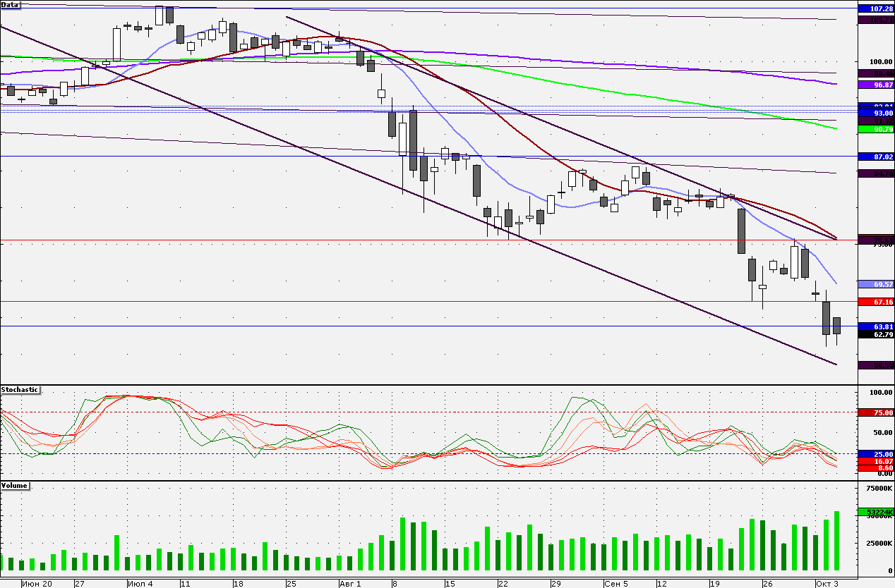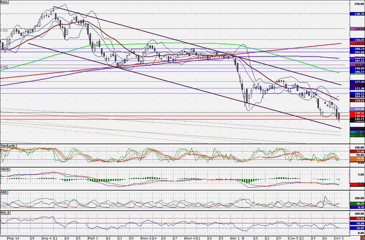 Несмотря на то, что в течение сессии акции все же обновили минимум, по итогам дня минимальное значение среды все же было удержано. Целью для разворота является 145,5 руб. Поддержкой выступает 140 руб. и далее вчерашний минимум – 139,40 руб. С точки зрений техники, акции привлекательны для спекулятивных покупок с целью достижения сопротивлений.