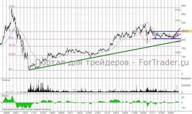 Важным знаком, подкрепляющим тех, кто держит «длинные» позиции в этих бумагах, является то, что это одни из немногих акций на нашем рынке, которые сохраняют долгосрочный тренд ноября 2008 года – 195 рублей. О позитивных намереньях игроков в отношении бумаг «Уралкалия» свидетельствует и индикатор MACD, укрепившийся в зоне «быков» и удерживающий её более месяца.