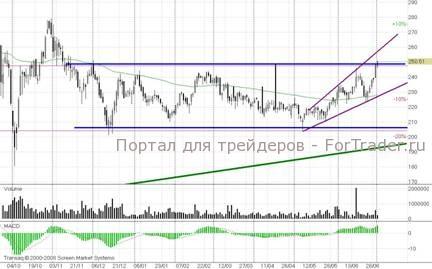 Тем не менее, сильный признак зарождения новых технических стимулов — это укрепление восходящего тренда от 7 мая 2012 года. Также «быков» не может не радовать то, с каким энтузиазмом и на каком объеме торгов бумаги попытались взять рубеж 247-250 рублей. Этот рубеж — не только уровень сопротивления, обозначенный пиками последних 7 месяцев, но и уровень коррекции по Фибоначчи 61,8% к падению в кризис.