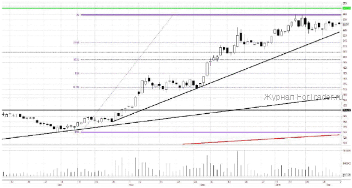 Рассмотрим акции Уралкалия с позиции технического анализа. Линия краткосрочного восходящего тренда проходит на текущий момент в районе 225 р.; среднесрочного тренда – в районе 165 р. Основной целью роста выступал уровень коррекции 61,8% по Фибоначчи от глобального снижения, который проходит на 245 р., к которой цена вплотную и приблизилась. В случае развития коррекционных настроений котировки снизятся вплоть до 200 р. , где проходит уровень коррекции 38,2% по Фибоначчи от октябрьской волны роста.