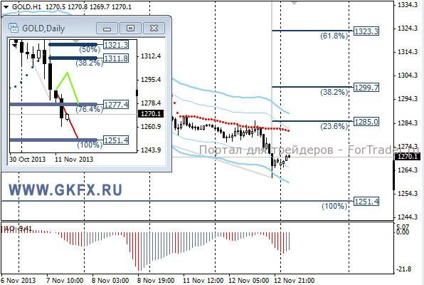 Цены на золото в соответствии с ожиданиями преодолели нижнюю границу торгового диапазона, и выполнилось условие по рекомендации. Первая цель для продаж была достигнута. Продолжаем держать продажи, так как давление на золото, скорее всего, продолжится. Традиционно делаю два варианта движения цены на неделю, основной красный и альтернативный зеленый. Значимые уровни на сегодня отмечены на часовом графике. Индикатор АО находится в отрицательной зоне и растет, указывая на коррекцию перед возможным продолжением снижения. Индикатор тренда указывает на снижение. Держим продажи от 1277,0 с целями 1260,0 и 1251,0. Стоп можно перевести в безубыток.