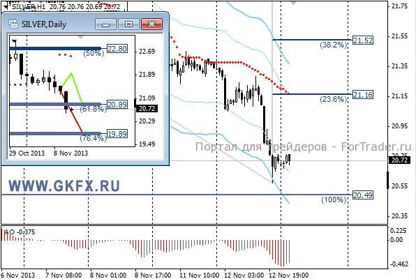 Цены на серебро преодолели ключевой уровень 21,25 еще утром, но днем давали еще одну возможность войти в продажи по этой цене. Две цели по рекомендации были достигнуты. Традиционно делаю два варианта движения цены на неделю, основной красный и альтернативный зеленый. Значимые уровни на сегодня отмечены на часовом графике. Индикатор АО находится в отрицательной зоне и растет, указывая на коррекцию перед возможным продолжением снижения. Индикатор тренда указывает на снижение. Держим продажи от 21,25 с целью 20,50.