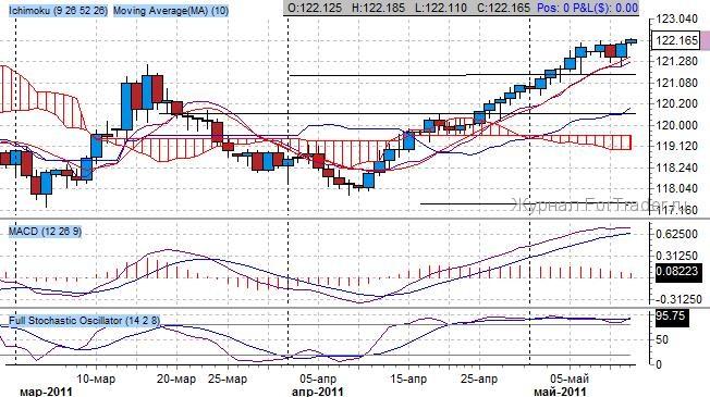 Среднесрочный тренд повышательный, текущая цель движения – достижение нового максимума на 122.20/32 и консолидация вокруг уровня 122.00/32.