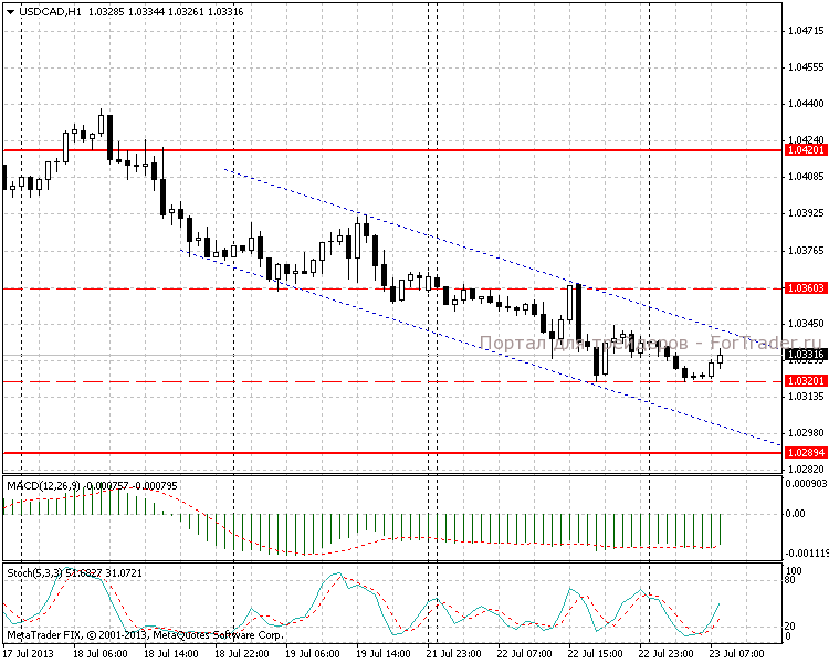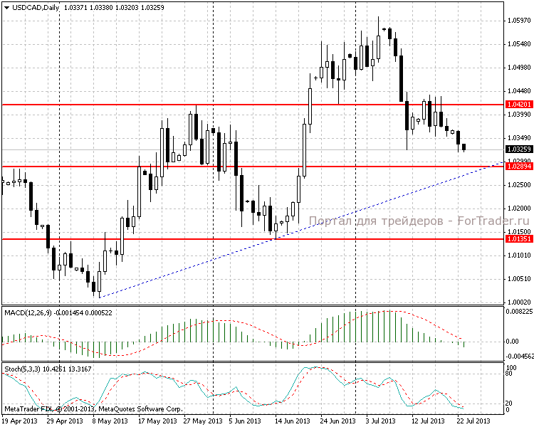 Вчера медведи обновили месячные минимумы, намекая, таким образом, на продолжение нисходящей коррекции. Цена дошла до уровня коррекции Fibo 61,8 от движения 14.06-5.07.13, постепенно приближаясь к линии тренда и области поддержки 1,0300-1,0280. Дневной стохастик зашел в область перепроданности, а MACD-гистограмма опустилась ниже нулевой отметки и снижается дальше.