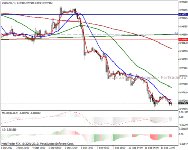 На часовом графике видим сильное нисхождение, был пробит важный уровень поддержки 0.9848 пунктов. Цена долгое время находилась в диапазоне 0.9900-0.9848 пунктов, но преимущество медвежьих позиций изменило настроение данного инструмента на противоположное. Таким образом, в дальнейшем ожидаем продолжения нисхождения к цели 0.9629 пунктов.
