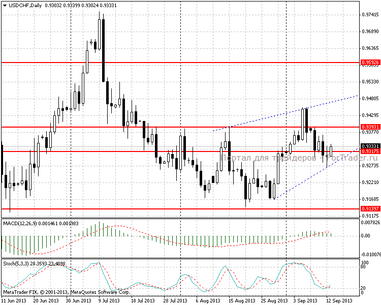 Последние несколько дней пара торговалась преимущественно в сторону продаж, что в основном обусловлено общим падением американской валюты относительно большинства конкурентов. На дневном таймфрейме видим, что цена расположилась вблизи области поддержке 0,9300-0,9320. В результате вчерашних торгов образовалась дневная свеча-доджи, максимум которой был пробит на сегодняшней азиатской сессии. Линии стохастического осциллятора пересеклись непосредственно над уровнем 20, тем самым усиливая сигнал на покупку.