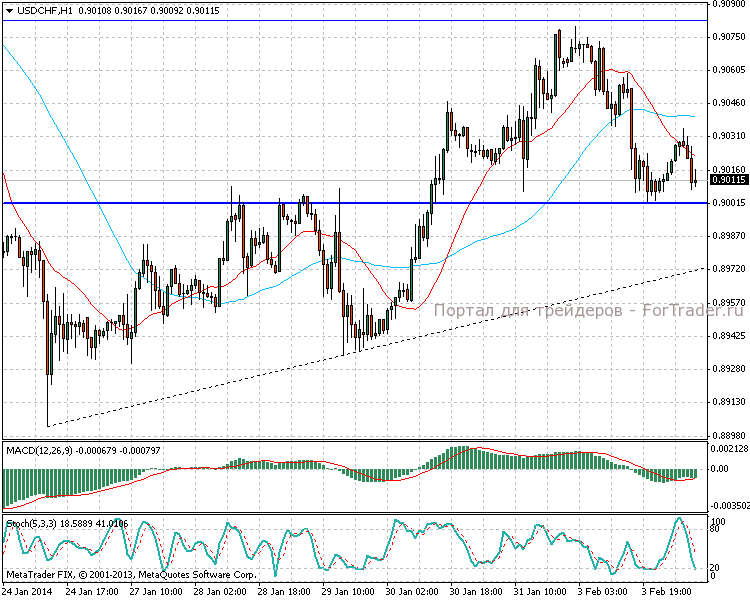 Вчера курс американского доллара скорректировался вниз относительно Швейцарской валюты по сравнению с пятничным ростом. Ослаблению доллара способствовали слабые данные по деловой активности в США. Цена достигла ключевой области поддержки 0,9000-0,8990.
