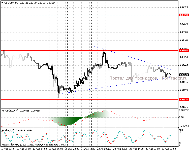 На дневном графике видим, что по данной валютной паре уже неделю торги происходят в коридоре между уровнями 0,9140 и 0,9285 с тенденцией к постепенному сужению диапазона. Общая тенденция остается понижательной, что обусловлено давлением на американский доллар, вызванным неопределенностью по поводу QE и негативной статистикой по рынку недвижимости в США.