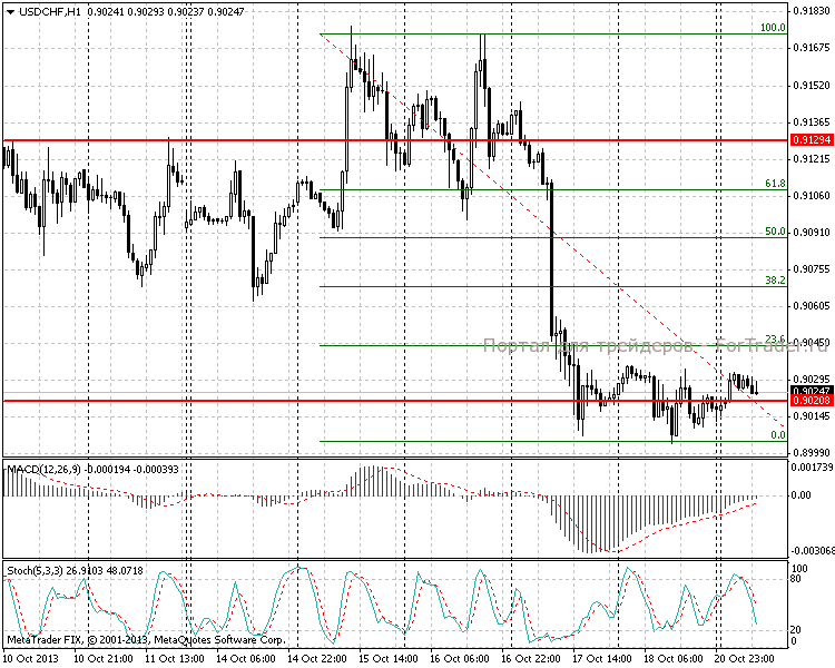 На часовом таймфрейме наблюдается боковое движение в диапазоне 35 пунктов. Как видим величина коррекции после падения 16-17.10.13 на 175 пунктов составляет менее 23,6% — что весьма немного. Часовой индикатор MACD подошел снизу к нулевой отметке и готовится ее пересечь, располагаясь при этом выше сигнальной линии.