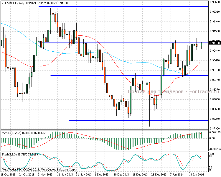 На дневном таймфрейме видим, что цена консолидировалась возле сильной области сопротивления 0,9100-0,9115. Вчерашняя попытка пробоя вверх оказалась неудачной и покупатели были отброшены назад на 50 пунктов. Таким образом на графике образовалась за вчерашний день свечка-доджи с довольно длинной верхней тенью, что в совокупности с выходом стохастика из зоны перепроданности дает сильный сигнал к продажам.