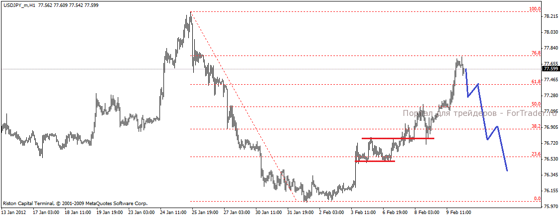 Как и предполагалось пара продолжила восходящее движение. Однако бычьи силы были недооценены, пара выросла более ожидаемого, достигнув уровня 76.8% фибо. Здесь мы видим попыткау медведей возобновить нисходящее движение пары, думается, им это удасться.