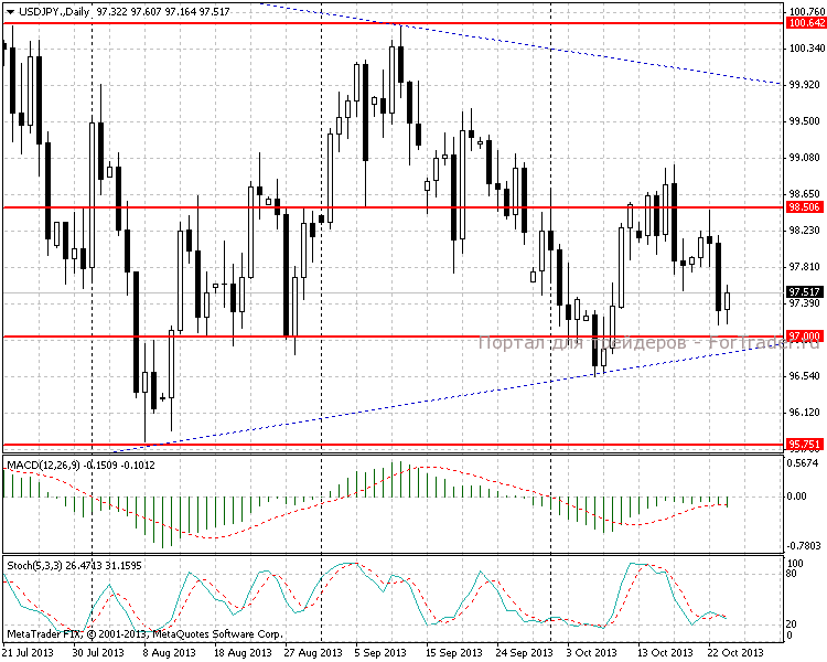 Отрицательная статистика по рынку труда США и негативные данные по Китайской банковской системе вызвали укрепление японской валюты. Пара USD/JPY достигла линии поддержки (проведена по минимумам 8.08 и 8.10.13) и ключевого уровня 97,00. Высота столбиков дневной MACD-гистограммы имеет тенденцию к снижению, тем самым подтверждая флет. Стохастик, коснувшись отметки 20, отскочил вверх.