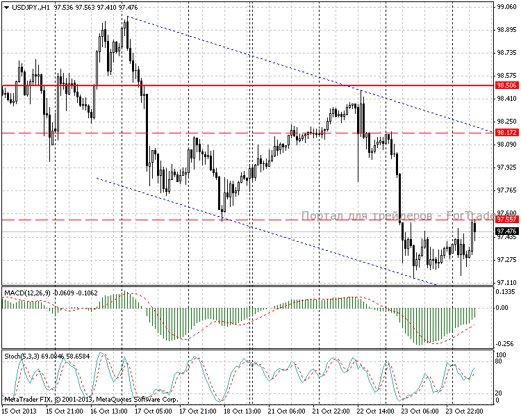 На часовом временном интервале наблюдается понижательная тенденция. После вчерашнего падения на 100 пунктов пара консолидировалась в диапазоне 97,15-97,55. Часовая MACD-гистограмма развернула направление и пересекла сигнальную линию снизу-вверх, подавая знак к началу коррекции.