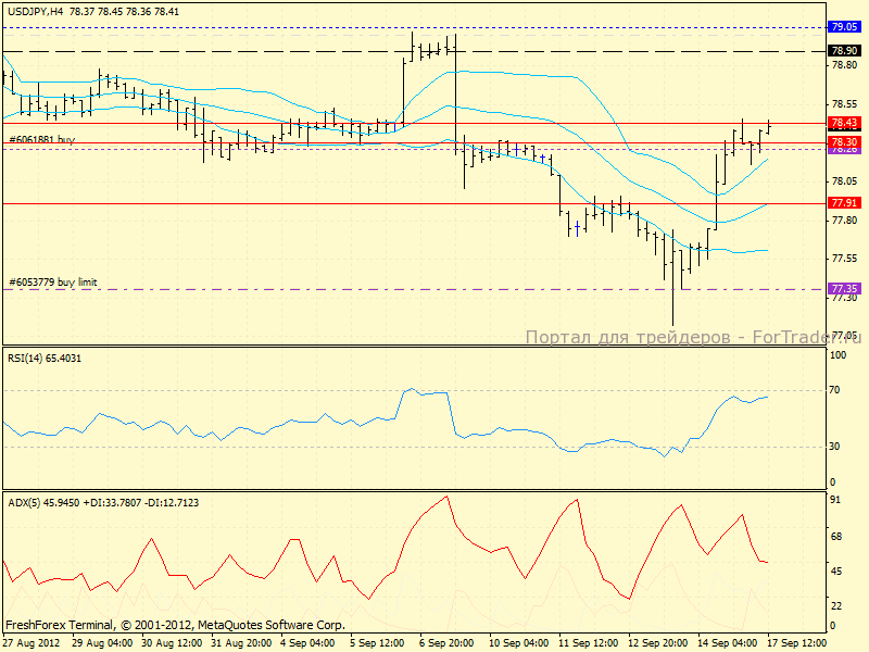 4х-часовой график: пара уткнулась в дневную среднюю (78.43), пробой которой откроет путь к 79.00. Если же сопротивление устоит, то мы увидим новое снижение к Н4-средней (77.81).