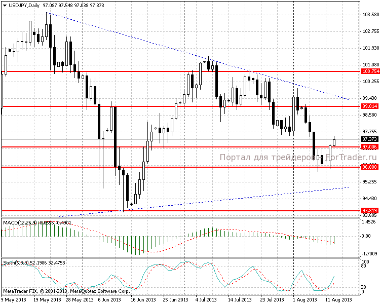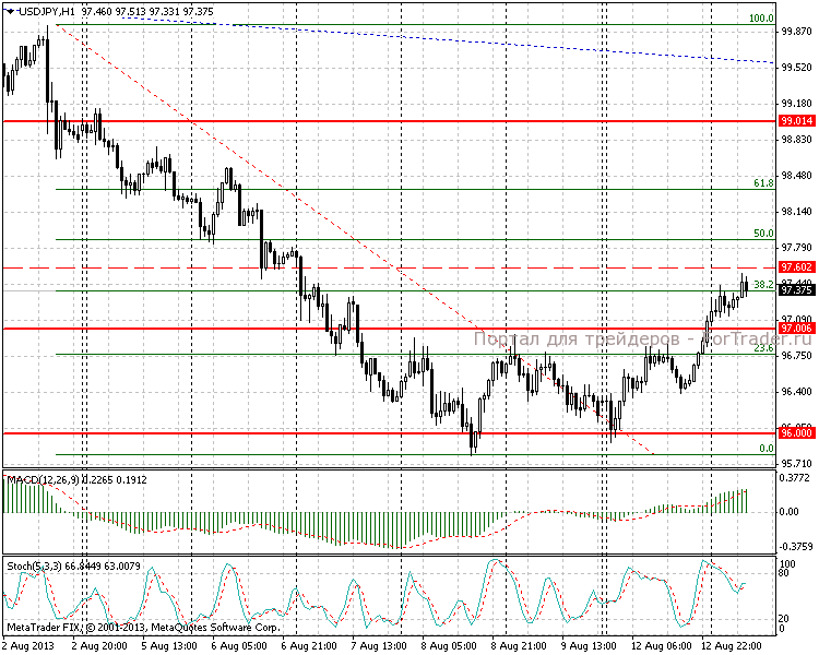 При переходе на часовой таймфрейм видим, что рост валютной пары был приостановлен на уровне 97,60, который представляет собой локальное сопротивление. В непосредственной близости расположен уровень коррекции Фибоначчи 38,2 от нисходящего движения в 400 пунктов от 2.08-8.08.2013, тем самым усиливая давление на покупателей. MACD-гистограмма продолжает рост, но уже заметны признаки некоторого замедления.