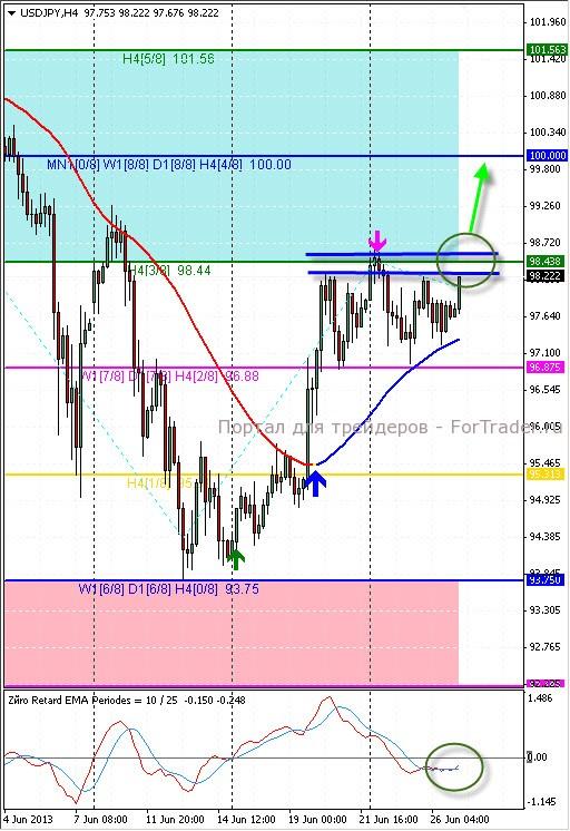 Покупаем пару при пробитии сильного промежуточного уровня сопротивления 98.30 малыми объемами, при этом наращиваем позиции в случае дальнейшего укрепления пары выше отметки 98.50 с первой целью 99.30, и более дальней целью 100.00.