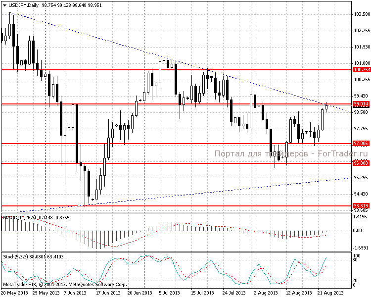 Вчерашний день был отмечен ростом мировых фондовых индексов: американский S&P 500 прибавил 1,2%, а японский Nikkei 225 возрос на 2,5%. Вслед за индексами валютная пара USD/JPY выросла более чем на 100 пунктов и достигла ключевого уровня 99,00 и линии сопротивления (верхняя граница треугольника). Дневной индикатор MACD подошел к нулевой отметке, подтверждая рост. Быстрая линия стохастика зашла в зону перекупленности.