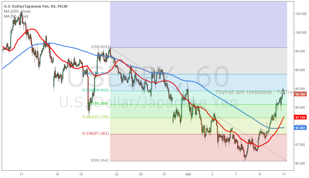 Валютная пара доллар США/японская йена продолжила ранее начавшийся тренд на укрепление после появления новостей о достижении прогресса в переговорах о госдолге США. При преодоления уровня сопротивления 98,44 валютная пара продолжит рост и сопротивлениями выступят уровни 99 — 99,60, а при их пробитии и уровень 100,50, где расположены локальные максимумы прошлого месяца.