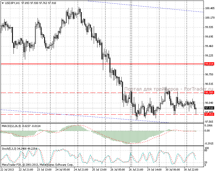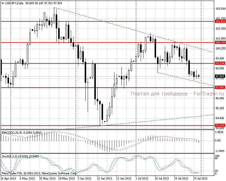 Участники рынка последовательно пробили ключевой уровень 99,00 и минимум 11.07.13, установленный на отметки 98,25. Новый месячный минимум зафиксирован в понедельник на уровне 97,62. Цена в данный момент расположена вблизи от линии канала, при этом индикатор MACD перешел в отрицательную область, а стохастический осциллятор показывает значение около 10 – все это свидетельствует о некоторой перепроданности рынка.