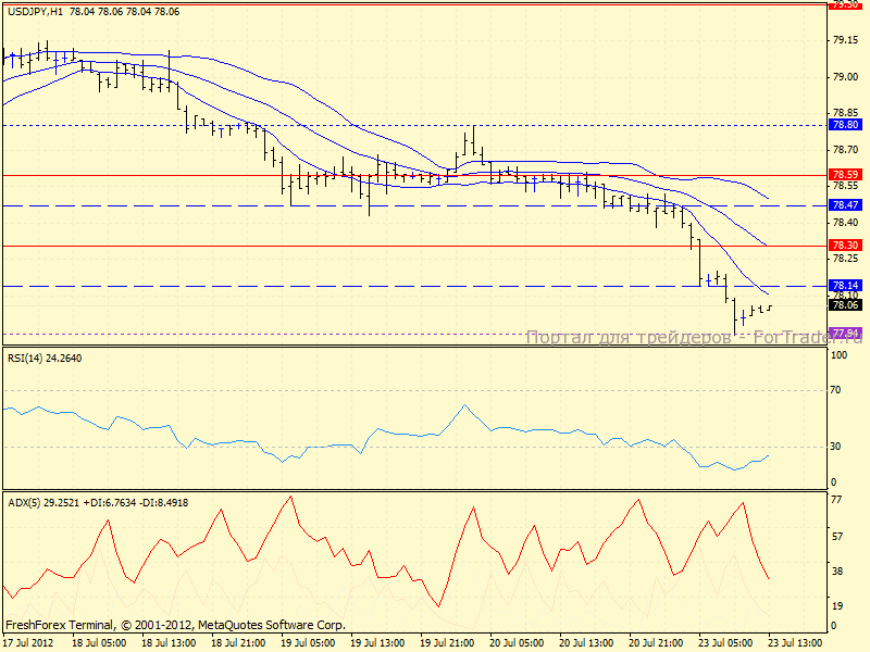 Часовой график: классическая восходящая коррекция с целями 78.14 и 78.30, откуда предположительно пройдет новая нисходящая волна со среднесрочной целью 77.54.