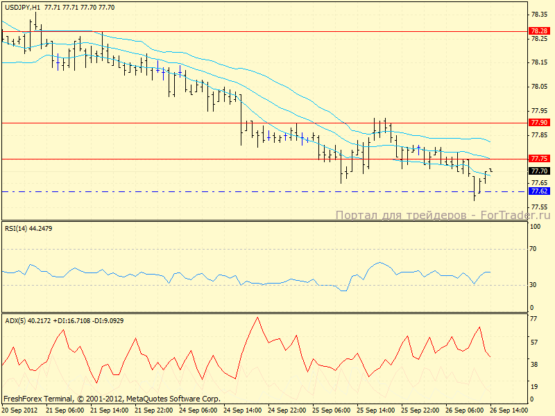 На часовом графике развивается боковик в диапазоне конвертов Боллинджера (77.62-77.90). С прорывом выше откроется дорога к дневной средней (78.28), но полагаю, что диапазон будет сохранен.