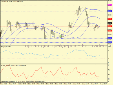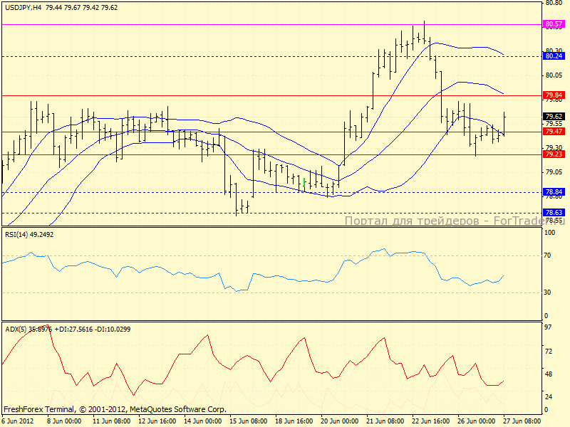 4х-часовой график: пара акивно оттесняется вверх. На средней Боллинджера (79.84) по всей видимости будет получено сопротивление, но связка ADX/RSI передает трендовый характер этого движения, поэтому мы будем ждать тестирования верхней полосы (80.24).