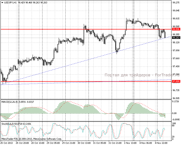 На часовом временном интервале наблюдается восходящий тренд. Цена зажата в диапазоне между линией поддержки и уровнем 98,50. MACD-гистограмма перешла в отрицательную область, но постепенно замедляет падение. Техническая картина указывает на возобновление роста в ближайшей перспективе.