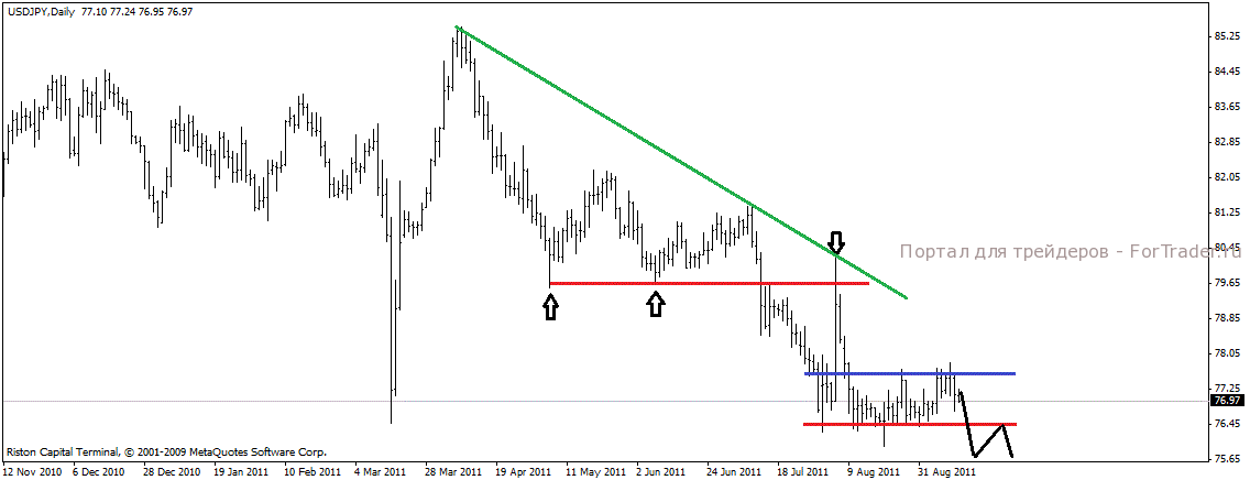 На дневном графике в данный момент, пара торгуется внутри канала, пробой одной из границ послужит сигналом для открытия сделок. В данной ситуации пробой нижней границы выглядит наиболее вероятной.
