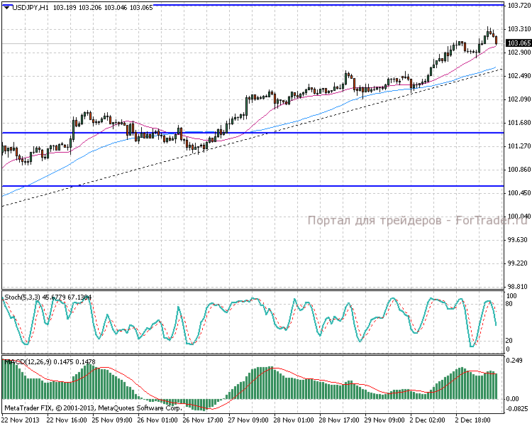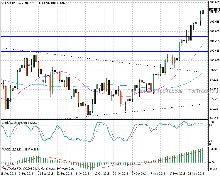Рассматриваемая валютная пара сформировала на дневном графике устойчивый растущий тренд на фоне проводимых стимулирующих мер со стороны Банка Японии. С другой стороны, росту американского доллара способствуют опубликованные индексы по деловой активности США. Цена впервые с мая 2013 года превысила отметку 103,00. Дневная MACD-гистограмма стремительно растет, а стохастический осциллятор показывает значение выше 90, добавляя рисков покупателям.