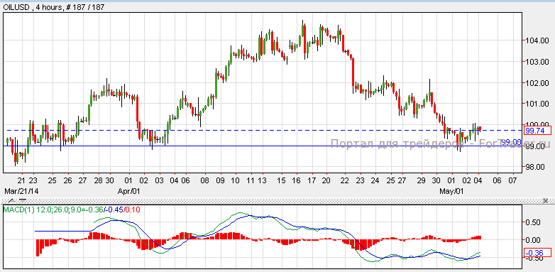 В пятницу нефть подешевела, однако сегодня она продолжает торговаться с восходящим импульсом. Нефть пробила уровень поддержки 99$, после чего откатилась и закрылась на цене 100$ за баррель. Этот импульс поддерживается индикатором MACD, который указывает на перепроданность нефти и возможный рост котировок. Согласно техническому анализу 4-часового графика, нефть торгуется на уровне поддержки $99, может вырасти к цене $101, или же вернутся к отметке 98.00$.