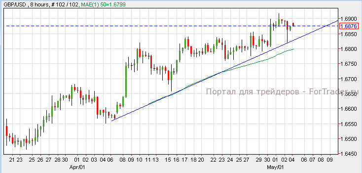 Фунт снизился против доллара после выхода индекса деловой активности в строительном секторе хуже прогнозов. Согласно техническому анализу 8-часового графика, пара GBP/USD торгуется на уровне поддержки 1.6840. Если GBP/USD удержит восходящий тренд с поддержкой 50-дневной скользящей средней, возможен рост пары к отметке 1.6940. Однако прорыв ниже уровня поддержки может вернуть пару к отметке 1.6800. Сегодня банки Великобритании закрыты на майские праздники.