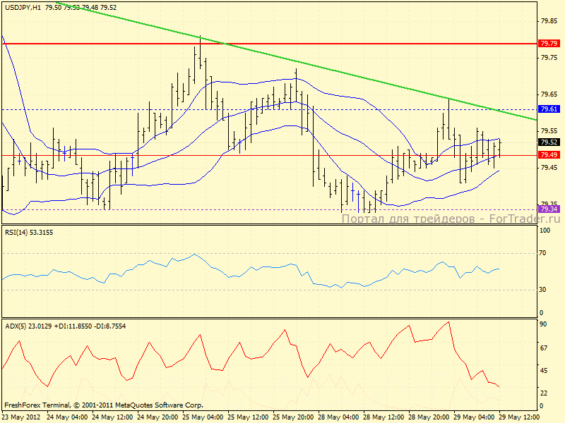 Часовой график: боковой канал 79.34-79.61, который зауживается в треугольник на пробитие вниз. Вероятнее, что не сегодня.