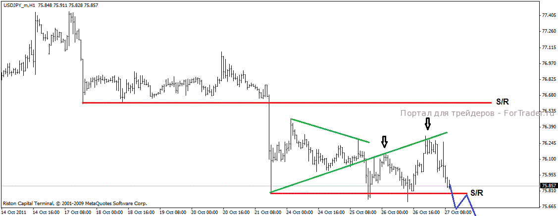 После пробоя треугольника цена дважды ретестировала пробитую границу треугольника и дважды цена отскочила вниз. В данный момент пара подошла к уровню поддержки, предположительно медведи смогут преодолеть этот уровень и снижение продолжиться. Возможен также отскок. Чтобы не гадать нужно посмотреть как цена поведет себя непосредственно на уровне поддержки и действовать согласно сложившейся ситуации.