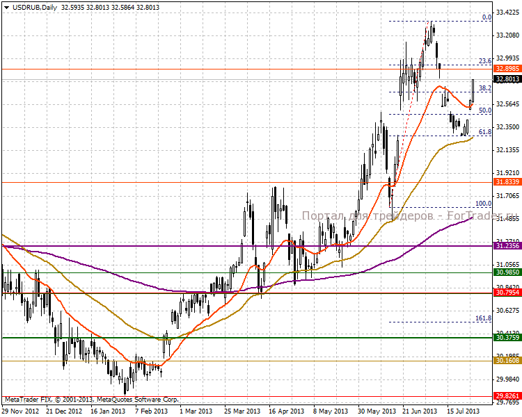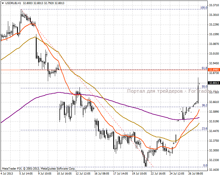 На часовом графике наблюдаем уверенный рост, в случае пробоя 61.8% уровня Фибоначчи пара развернет локальную тенденцию. Данные восходящие импульсы выглядят как коррекция, однако средние ЕМА указывают на длительную растущую динамику. В случае отскока от 32.8985 пунктов пара прямиком пойдет к 31.8339 пунктов.