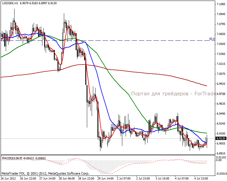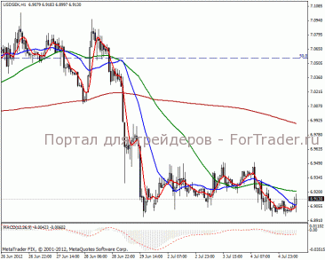 На часовом графике видим боковик с продолжительностью в одну торговую неделю. Пара таким образом отыгрывает сильное нисхождение и рынку не хватает силы сопротивляться медвежьим позициям. Первая цель стоит в отметке 6.76 пунктов в краткосрочной перспективе рекомендуем вставать в короткую.