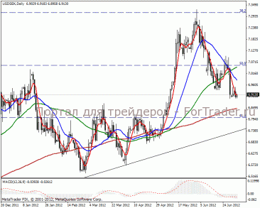На дневном ценовом графике наблюдаем длительный восходящий тренд. В среднесрочной перспективе при текущей тенденции достигнем цели 7.62 пунктов к концу текущего месяца. Но где-то в это время должен произойти разворот тенденции и к началу 2013 года пара подойдет к отметке в 5.85 пунктов.