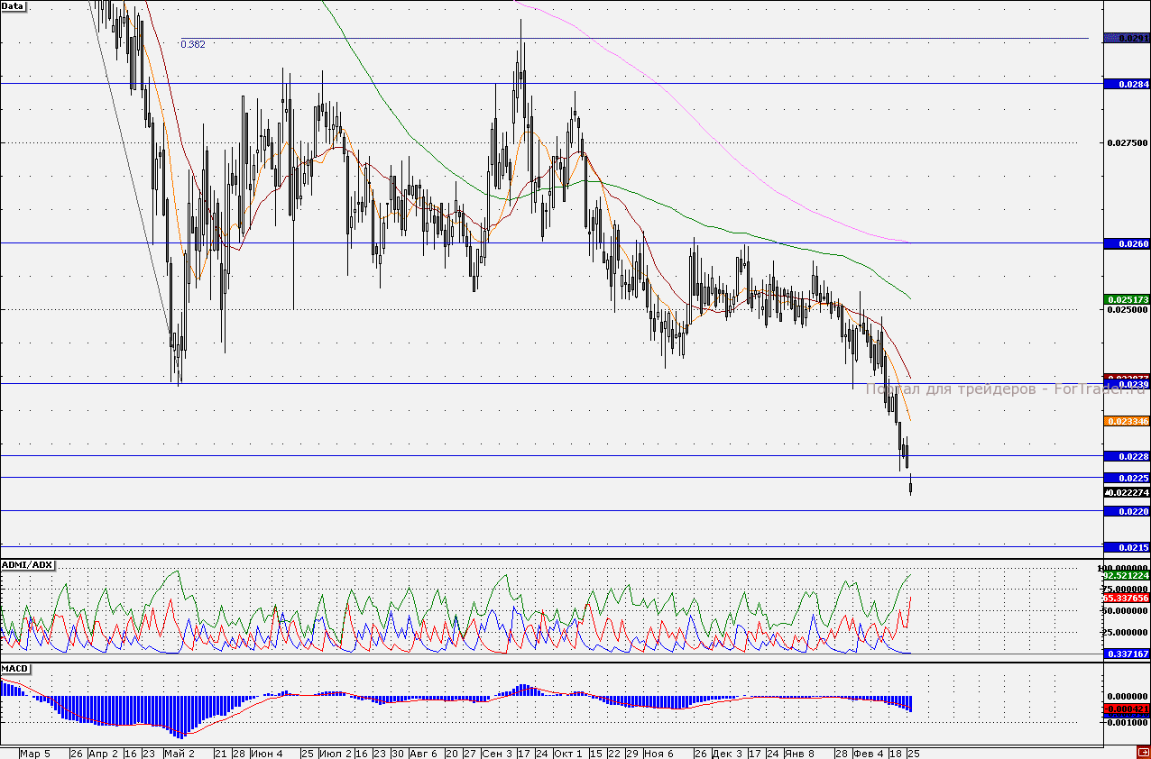 Динамику хуже рынка в первой половине сессии демонстрируют акции «Интер РАО ЕЭС». В первой половине дня акции ушли ниже важной поддержки 2,25 коп. Показания трендовых индикаторов свидетельствуют о сохранении негативной тенденции в акциях энергокомпании. Так, график индикатора MACD(12;26;9) снижается на отрицательной территории, а  индикатор ADMI/ADX показывает, что силы «медведей» по бумагам преобладают (линия «медведей» находится выше линии «быков»). Кроме того, новостной фон вокруг компании не располагает к открытию длинных позиций, в частности, на прошлой неделе были оглашены слабые финансовые результаты по РСБУ за 2012 год. Таким образом, короткие позиции по бумагам более привлекательны. Ближайшей целью для снижения может выступить отметка 2,20 коп., где находится минимум сентября 2009 года. Наш 30-минутный торговый робот находится в «шортах», удерживая короткие позиции от отметки 2,26 коп.