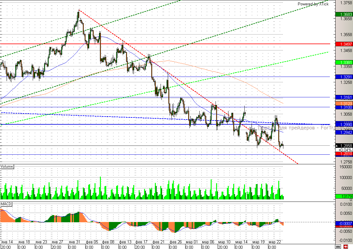 Европейская валюта растет сегодня в основном просто в рамках коррекции. Между тем статистика по Европе сегодня вышла негативной и лишь оказывает дополнительно давление на евро/доллар. Таким образом, потребительское доверие во Франции в марте неожиданно снизилось с 86 до 84. Технически пара евро/доллар, хоть и находится под своей 200-дневной скользящей средней, но не так давно преодолела нисходящей тренд, что может поддержать ее в новом походе к 1,3.