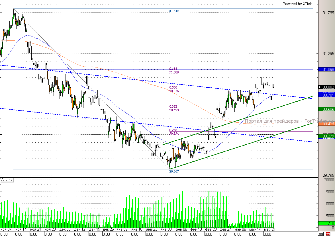 При этом на рубль сегодня давят нефтяные котировки, которые теряют более 0,2% в преддверии данных по запасам нефти в американских нефтехранилищах. Фактор налоговых платежей российскими экспортерами, поддерживающий российскую валюту еще вчера, также сошел на нет. Следующие крупные платежи будут только в четверг, а до тех пор увеличения спроса на рубли ждать неоткуда. Таким образом, если доллару удастся преодолеть 31, где были недавние максимумы, то целью станет отметка 31,1, в которой находится 61,8% по Фибоначчи к предыдущей волне снижения. В обратном случае рубль устремится к 30,6.