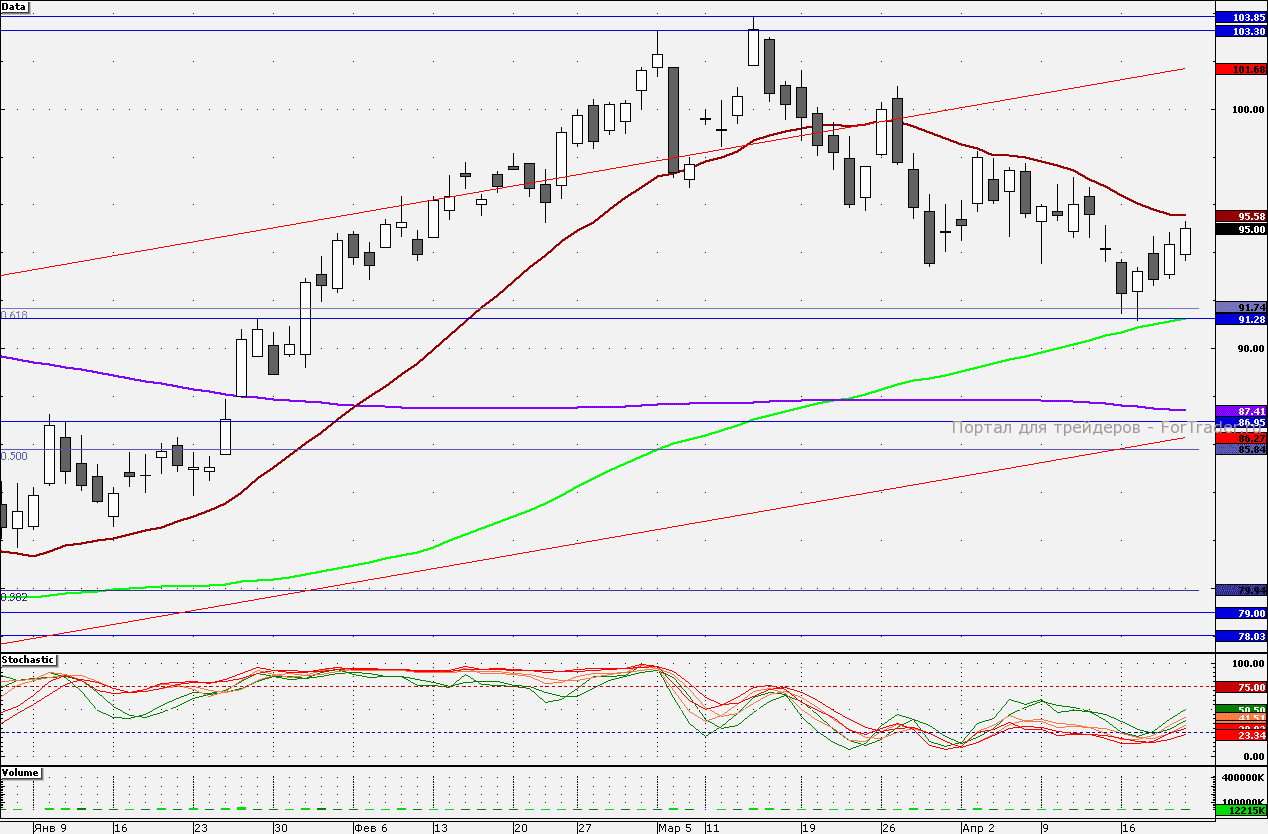 Акции Сбербанка закрылись на отметке 95,00 руб. Внешний фон ухудшился, что не располагает к тестированию 21-дневной скользящей средней – 95,58 руб. Поддержкой является 92,5 руб.