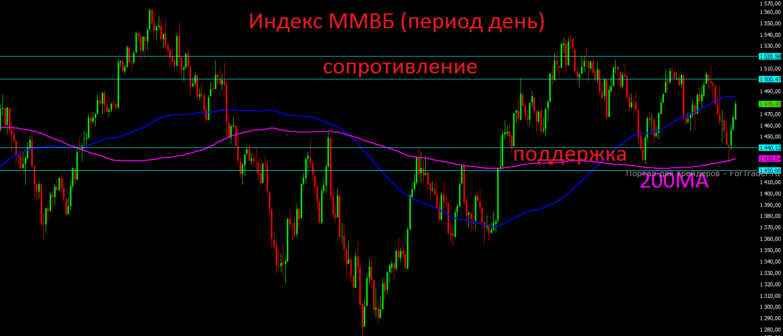 В заключении разберём техническую ситуацию по российскому индексу ММВБ. На прошедшей неделе мы видели чёткий разворот от важного и сильного уровня поддержки вблизи 200-дневной скользящей средней. С графической точки зрения, модель “три индейца”- три белых дневных свечи является очень сильной, и чаще всего приводит к продолжению восходящей динамики, однако, мы уже не рекомендуем входить в рынок тем, кто опоздал и не сделал этого на прошлой неделе. Потенциал роста по индексу видится пока не более 1-2%. Ключевое сопротивление в диапазоне 1500-1520 пунктов вновь будет выступать сильной преградой и пока не видится на горизонте никаких сильных драйверов, которые смогли бы помочь инвесторам преодолеть этот рубеж. Тем, кто более спекулятивно работает на фондовом рынке, мы ещё в пятницу дали рекомендацию сокращать все длинные позиции, а тем, кто работает более среднесрочно, стоит удерживать позиции до явного подтверждения разворота в виде слабого закрытия дня, на отрицательной территории.