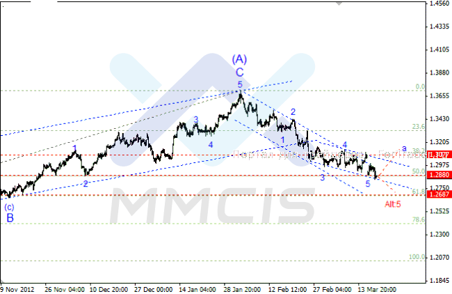 Поэтому основной сценарий, согласно которому нисходящий импульс завершен в районе текущих минимумов, остается в силе, и в ближайшие дни можно ожидать восстановления курса в направлении 31-й фигуры в рамках построения волны «а» коррекционной тройки старшего порядка. Альтернативный сценарий аналитиков по-прежнему допускает, что пара может возобновить нисходящее движение в направлении уровня 1.2687, который представляет собой 61.8% коррекции Фибоначчи, в рамках завершающей фазы волны «Alt:5».