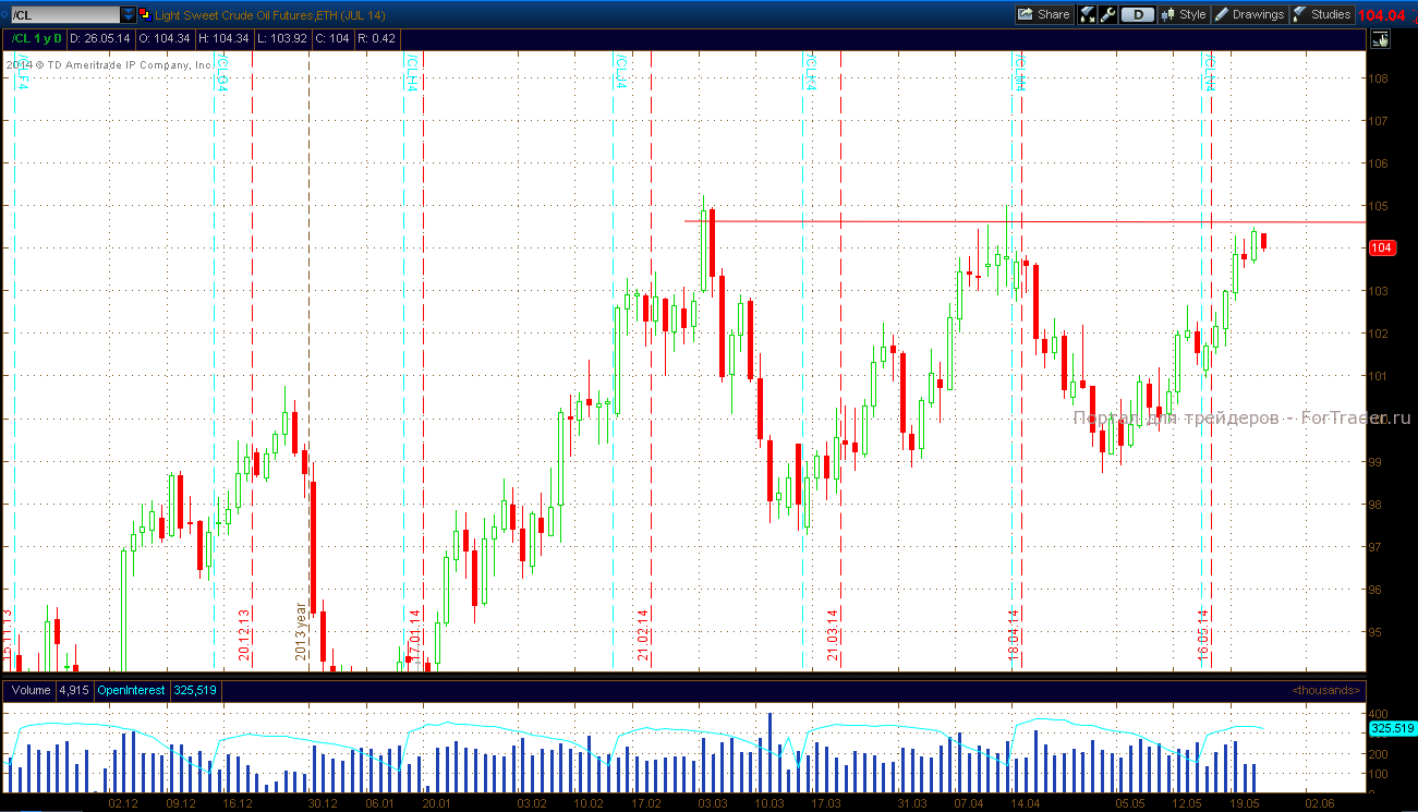 Цены на нефть WTI с поставкой в июне снижаются, после того как достигли апрельских вершин. Сегодня июньский фьючерс торгуется на уровне $104 за баррель. Помимо Украины на динамику котировок повлияло заявление Государственного совета Китая. В будущем страна планирует снизить потребление энергии на единицу валового внутреннего продукта на 3,9% до 2015 года. Поскольку КНР является второй державой в мире по объёмам потребления нефти, то на стоимости чёрного золота снижение спроса скажется негативно. С технической точки зрения, у техасской нефти также есть повод для коррекции.